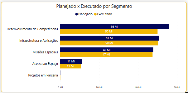 Em 2023, a Lei Orçamentária Anual 2023, LOA, destinou R$ 165,6 Milhões de reais para os programas PNAE e PESE, que são os programas espaciais Civis e Militares respectivamente