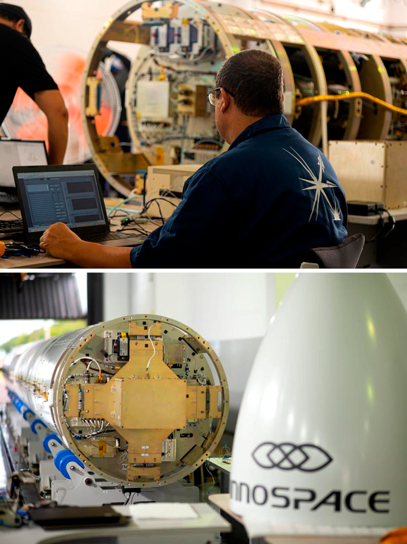 DCTA Montagem do Sistema de Navegação Inercial (Sisnav) no foguete sul-coreano (no alto) e o dispositivo totalmente instaladoDCTA