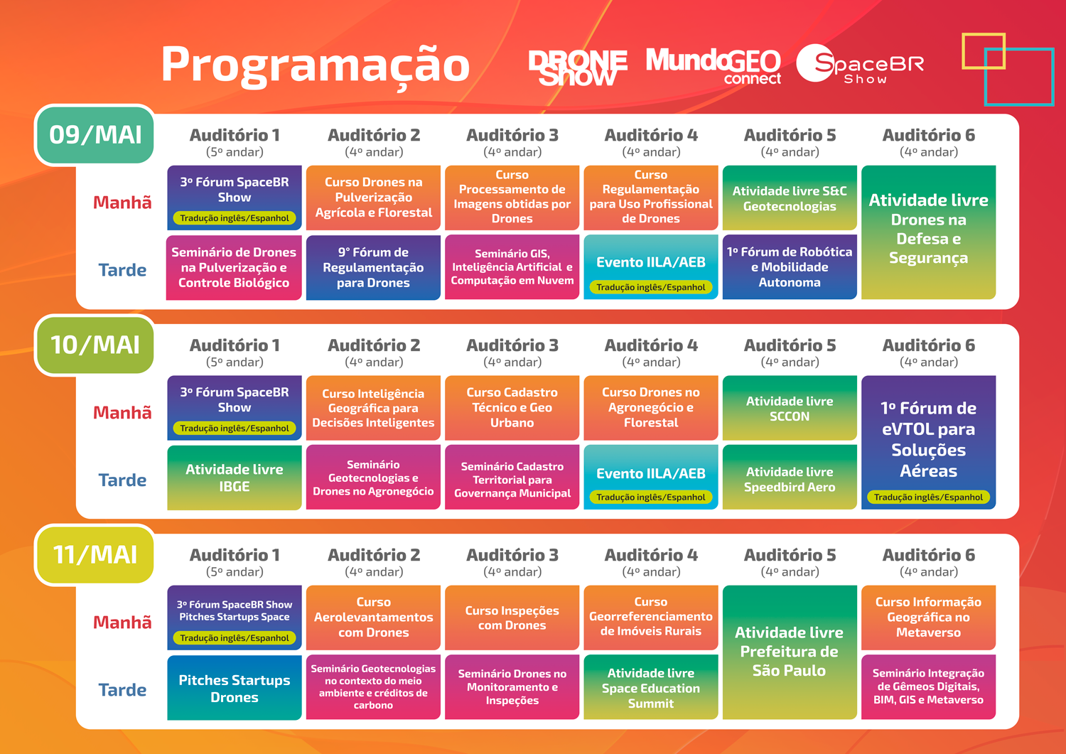 O terceiro dia seguiu com o 3º Fórum SpaceBR Show e com a competiçao de startups dos setores espacial e de drones. Na parte da manhã aconteceram quatro cursos: Aerolevantamentos com Drones, Inspeções com Drones, Georreferenciamento de Imóveis Rurais e Informação Geográfica no Metaverso. Workshops livres para os visitantes da feira tiveram destaque: GeoSampa e Space Education Summit. Na parte da tarde, tiveram lugar três seminários, sobre Geo no contexto do meio ambiente, Monitoramento/Inspeções com Drones e Integração de gêmeos digitais, BIM e metaverso.