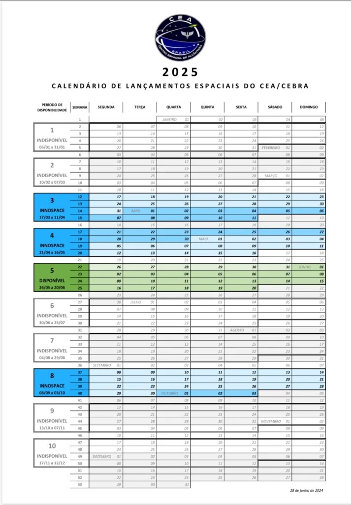 No dia 28 de junho, a Força Aérea Brasileira (FAB) sediou a reunião anual para a distribuição de períodos destinados a lançamentos espaciais em 2025. O evento, que seguiu as diretrizes estabelecidas pelo Comando da Aeronáutica (COMAER), foi conduzido pela Comissão de Coordenação e Implantação de Sistemas Espaciais (CCISE).